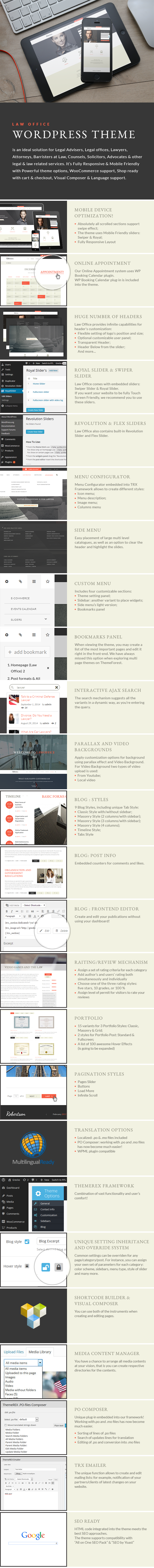 Law Office Wordpress Theme is an ideal solution for Legal Advisers, Legal offices, Lawyers, Attorneys, Barristers at Law, Counsels, Solicitors, Advocates and other legal and law related services. It’s Fully Responsive and Mobile Friendly with Powerful theme options, WooCommerce support, Shop ready with cart and checkout, Visual Composer and Language support.Key Features